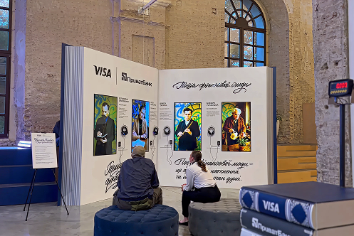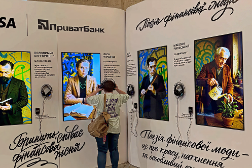An installation titled The Poetry Book of Financial Fashion was developed using AI voice synthesis. NFC technology allowed visitors to activate personalized audio content by tapping a Visa card issued by PrivatBank near each author’s portrait. Each author featured unique poems and texts delivered through synthesized voices.